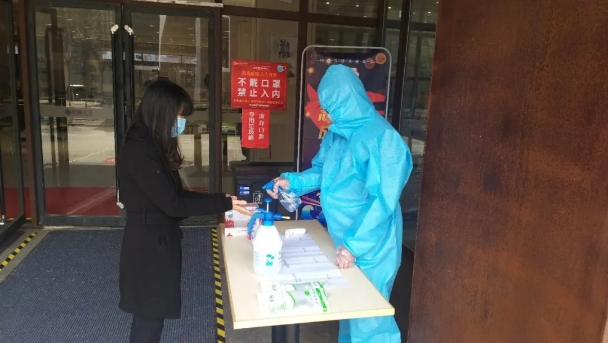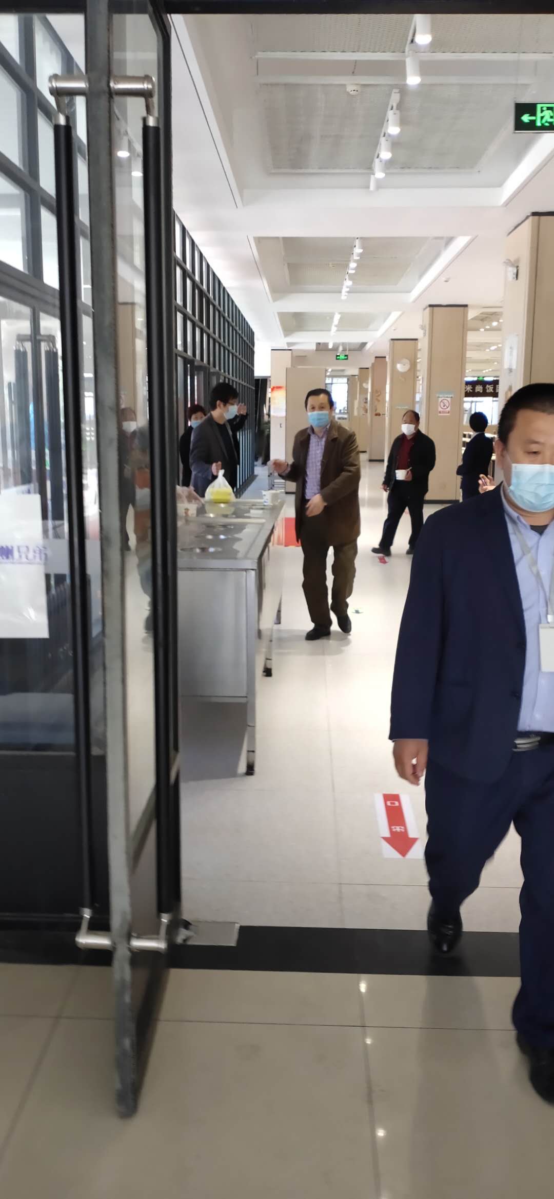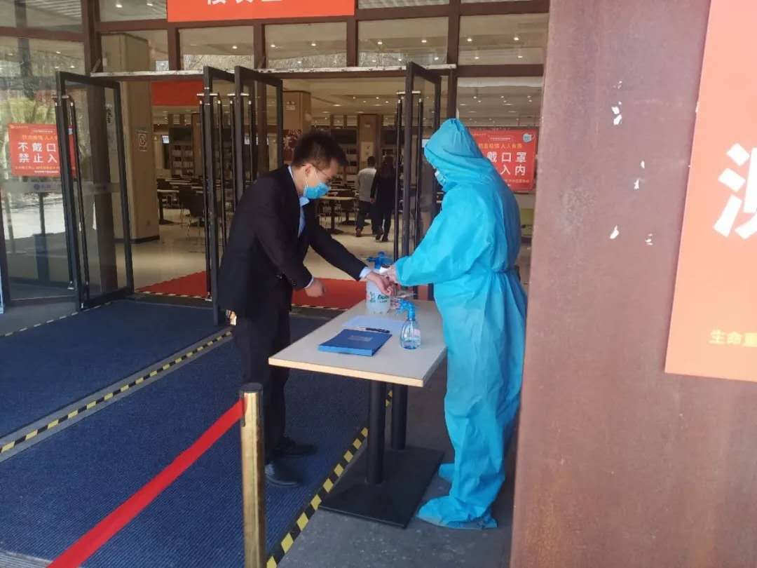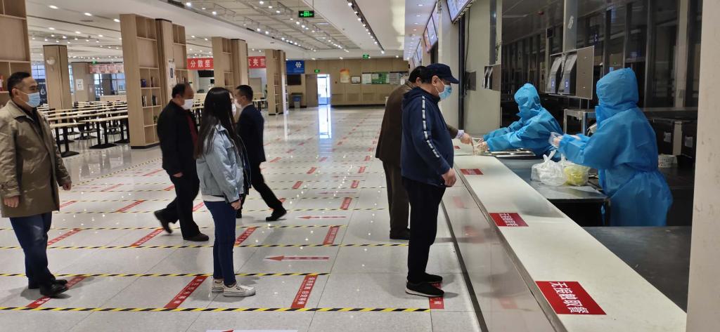 演练中,根据《山东艺术学院疫情期间食堂就餐流程》规定,所有人员在食堂门口间隔一米排队,首先通过鞋底消毒区,进行体温检测,并进行手部消毒。体温低于37.3摄氏度方可进入食堂,若体温超过37.3摄氏度,由专人带至留观监测点进行研判并做出及时处置。进入食堂后,引导员引导就餐人员按照地面标示路线,进行排队取餐。餐食打包带回人员根据地面标示路线,离开食堂。堂食人员按路线到就餐区,单人单桌同向就餐。就餐完毕,将餐具放置指定回收处后,由出口离开。